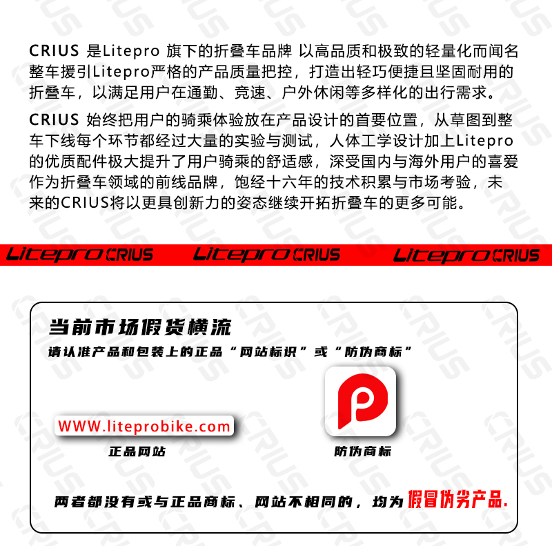 青岛利特普乐自行车有限公司是自行车、折叠自行车、自行车零配件等产品生产加工的公司,litepro品牌2008年创立于北京霍营,由一间工作室慢慢发展壮大,深受国内外客户的喜爱,同时也被一些商家模仿抄袭,认准正品!!