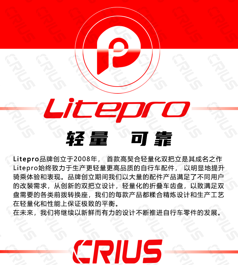 青岛利特普乐自行车有限公司是自行车、折叠自行车、自行车零配件等产品生产加工的公司,litepro品牌2008年创立于北京霍营,由一间工作室慢慢发展壮大,深受国内外客户的喜爱,同时也被一些商家模仿抄袭,认准正品!!